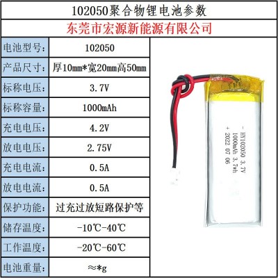 102050聚合物鋰電池衣柜燈3.7V1000mAh頭燈LED鋰離子軟包充電 電池