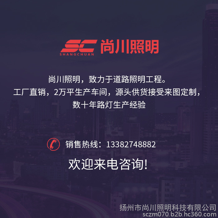 ??尚川照明致力于城市道路的“亮化工程”而努力! 我們竭誠(chéng)為廣大新老客戶提供優(yōu)良、廉價(jià)的產(chǎn)品。總經(jīng)理丁總攜全體員工竭誠(chéng)歡迎您來(lái)?yè)P(yáng)州觀光、指導(dǎo)!熱忱歡迎全國(guó)各地有識(shí)之士,愿與您攜手并進(jìn),共創(chuàng)美好明天!