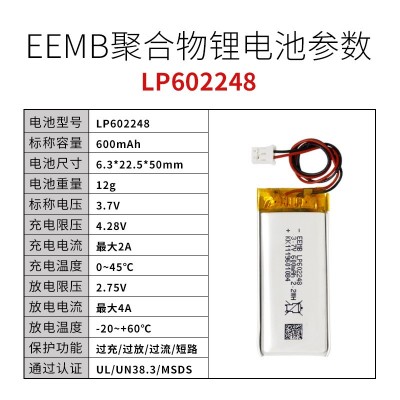 立即發(fā)布求購意向本網(wǎng)頁所展示的有關(guān)【LP602248聚合物鋰電池3.7V 600mAh可充電鋰電池電芯EEMB廠家 直供_聚合物鋰電池_湖北中聚能源有限公司】的信息/圖片/參數(shù)等由清潔能源網(wǎng)的會員【湖北中聚能源有限公司】提供,由清潔能源網(wǎng)會員【湖北中聚能源有限公司】自行對信息/圖片/參數(shù)等的真實性、準確性和合法性負責,本平臺(本網(wǎng)站)僅提供展示服務(wù),請謹慎交易,因交易而產(chǎn)生的法律關(guān)系及法律糾紛由您自行協(xié)商解決,本平臺(本網(wǎng)站)對此不承擔任何責任。您在本網(wǎng)頁可以瀏覽【LP602248聚合物鋰電池3.7V 600mAh可充電鋰電池電芯EEMB廠家 直供_聚合物鋰電池_湖北中聚能源有限公司】有關(guān)的信息/圖片/價格等及提供【LP602248聚合物鋰電池3.7V 600mAh可充電鋰電池電芯EEMB廠家 直供_聚合物鋰電池_湖北中聚能源有限公司】的商家公司簡介、聯(lián)系方式等信息。